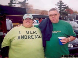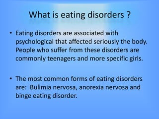 Eating disorders are psychological conditions that seriously affect the body, most commonly affecting teenagers and girls. The main eating disorders are bulimia nervosa, anorexia nervosa, and binge eating disorder. The causes of eating disorders are often emotional and personality problems related to stress, family pressure, low self-esteem, poor body image, depression, and difficulty expressing feelings. Bulimia is characterized by binge eating followed by purging, while anorexia involves excessive weight loss and fear of gaining weight. Statistics show that 0.5-3.7% of females will experience anorexia and 1.1-4.2% will experience bulimia in their lifetimes.