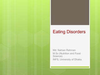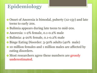 This document discusses eating disorders such as anorexia nervosa, bulimia nervosa, and binge eating disorder. It provides information on the epidemiology, underlying causes, signs and symptoms, medical complications, diagnostic criteria, screening tools, treatment options, and the role of primary care providers in managing these conditions. Eating disorders typically have an onset during adolescence or young adulthood and disproportionately affect females. Treatment involves a multidisciplinary team approach including medical monitoring, nutritional counseling, and psychological therapies like CBT.