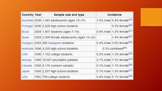 Eating disorders are psychological illnesses defined by abnormal eating habits that can involve insufficient or excessive food intake impacting physical and mental health. The most common types are anorexia nervosa, bulimia nervosa, binge eating disorder, and OSFED. Anorexia is characterized by food restriction and fear of weight gain. Bulimia involves binge eating followed by purging. Treatment for both typically involves family-based therapy, cognitive behavioral therapy, and sometimes antidepressants, with recovery often taking months or years.
