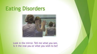 This document discusses eating disorders such as anorexia and bulimia. It provides facts about the disorders and their prevalence. The goals of treatment are to restore normal body weight and eating habits through therapy, medication, and nutrition counseling. Prevention strategies include promoting a balanced diet and positive body image. The document also outlines ways to market education programs about eating disorders to youth groups and through social media, and how such programs can be funded and evaluated.