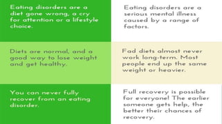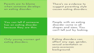 3) Eating disorders have complex causes involving biological, psychological, and environmental factors like genetics, negative body image, and cultural pressures.