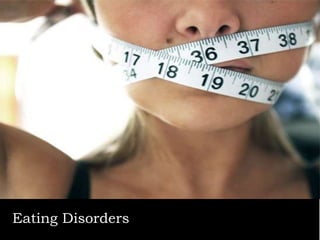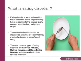 Eating disorders are medical conditions characterized by irregular eating habits and excessive concern with body weight and shape. The three main types are anorexia nervosa, bulimia nervosa, and binge-eating disorder. Eating disorders have biological, psychological, and social causes and can develop in both females and males. Anorexia involves restricted eating and pursuit of thinness despite being underweight. Bulimia involves binge eating followed by purging. Binge-eating disorder involves eating large amounts of food without purging. Treatment involves psychotherapy, medical monitoring, nutritional counseling, and sometimes medications.