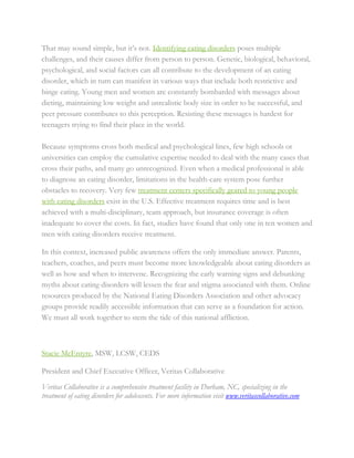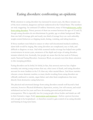 Eating disorders are a widespread and dangerous issue in the U.S., affecting approximately 25 million Americans, predominantly young women. These disorders lead to high mortality rates and long-lasting physical and emotional damage, yet are often challenging to diagnose and treat due to various contributing factors. Increased public awareness and education on early signs and effective interventions are crucial to address this epidemic.