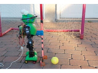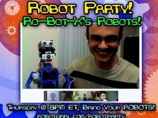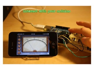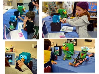 Erin RobotGrrl discusses using apps to interact with Arduino projects. Apps for Arduino provides a simple framework that allows Arduino hardware to work with computers and iOS devices through software. The apps are open source and action-based rather than pin-based. RobotGrrl also describes her educational robotic pet project called RoboBrrd, which uses lasercut parts, an Arduino brain board, and interactive software to teach programming and electrical concepts to students ages 10-16.