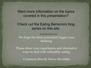 This document provides 49 tips for dealing with unhealthy eating behaviors. Some key issues discussed include the high rates of obesity in the US, the influence of large portion sizes at restaurants, and how mood, stress, sleep, and social situations can impact eating habits. Specific tips include pre-plating food to control portions, using rituals to improve mood before eating, mindfully savoring each bite to feel full sooner, managing stress to prevent overeating, dining with others to slow the pace of eating, and focusing on enjoyment to promote healthy behaviors long-term. The document encourages becoming more mindful of triggers and finding balanced approaches to food.