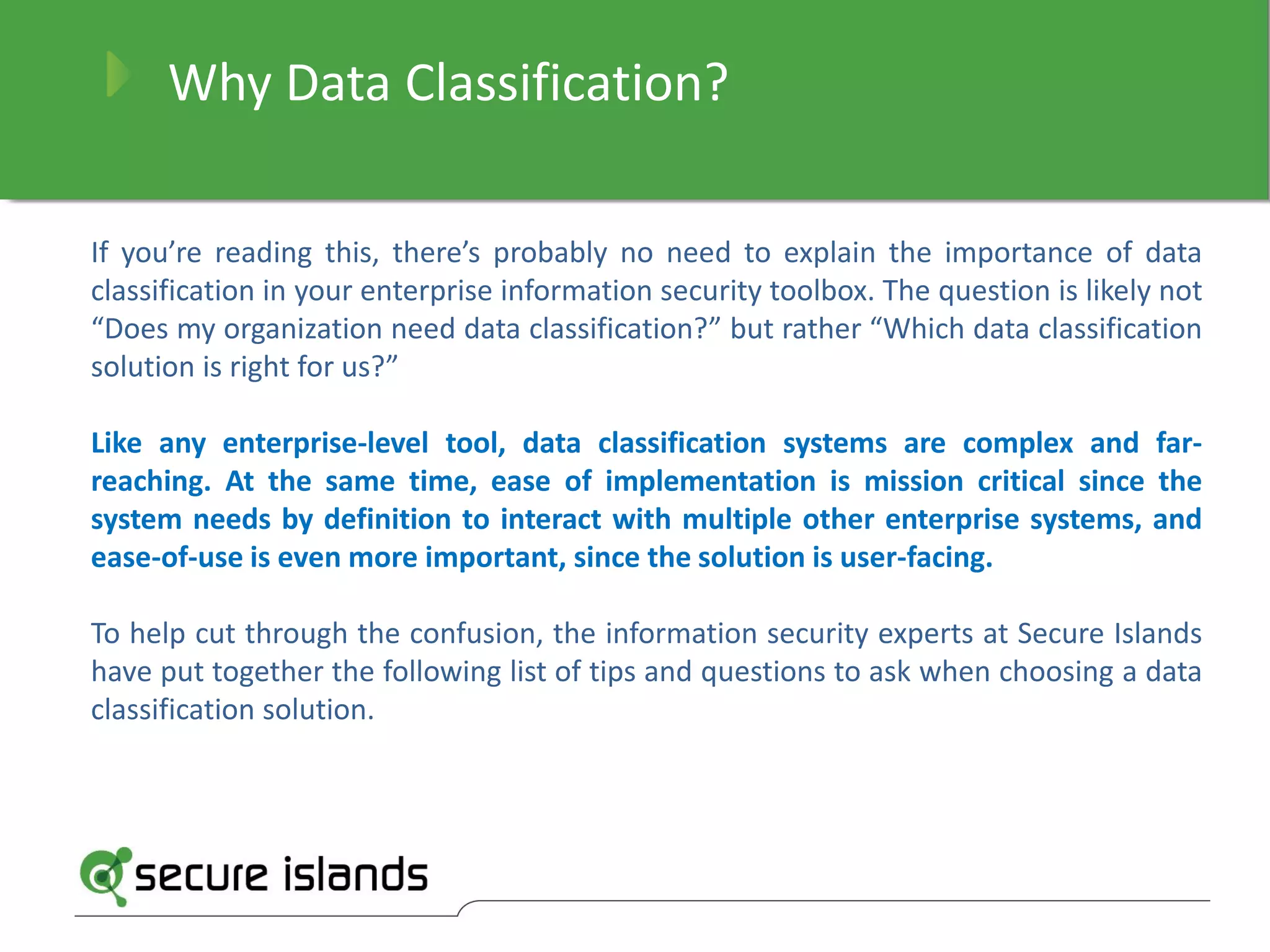 The document provides a comprehensive guide on selecting data classification solutions for enterprises, emphasizing the importance of a hybrid approach that combines automatic and manual classification. It outlines 18 critical factors to consider, including policy-driven classification, integration with existing systems, customizable enforcement, and the ability to handle multi-source and multilingual data. The conclusion highlights Secure Islands' information classification technology as a robust solution that ensures accurate and flexible data management throughout its lifecycle.