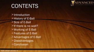 The document discusses E-Ball, a spherical computer. It has a history and works by using infrared rays, lasers, and RF signals to function as a keyboard, mouse, and projector for displaying content on walls or paper screens. Key features include storage, RAM, speakers and connectivity options. Advantages are portability and support for presentations, while disadvantages include high costs and difficulty troubleshooting hardware issues. The conclusion discusses how E-Ball represents future innovations in portable computing.