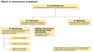 After economic liberalization in India, banks were forced to change their approach and embrace new technologies like e-banking to compete with foreign banks. E-banking allows customers to access banking services electronically without visiting a physical branch. It has grown in popularity in India and provides benefits like increased convenience, higher interest rates, and more services for customers. However, e-banking also presents challenges around security, lack of personal relationships, and limited complex transaction capabilities compared to traditional banking. Overall, e-banking has benefited both banks and customers in India but still needs increased awareness and education among users.