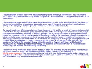 Q3 2008 financial results were in line or exceeded expectations. Revenue grew 12% year-over-year to $2.2 billion while non-GAAP earnings per share grew 11% to $0.46, exceeding the high end of guidance. The company also generated $543 million in free cash flow. However, eBay noted the weak macroeconomic environment was impacting its business through slower growth in U.S. ecommerce sales and same-store sales for its Merchant Services transaction processing volume.