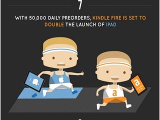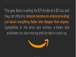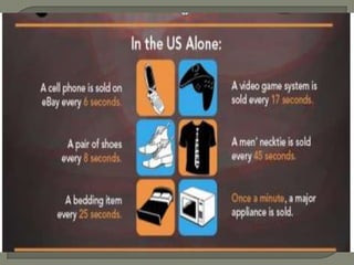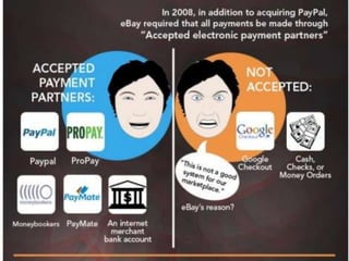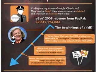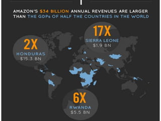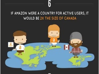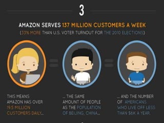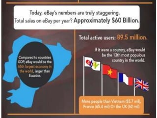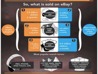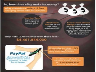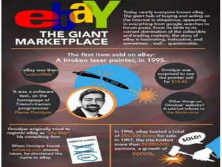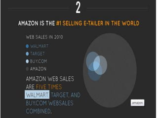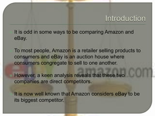The document compares Amazon and eBay on several key points. It notes that while they are often seen as different types of companies, they can also be considered direct competitors. It then provides a table summarizing their founding years, areas served, revenues, employees and other details. Following this is a discussion of how Amazon users spend nearly five times more per user than eBay users.