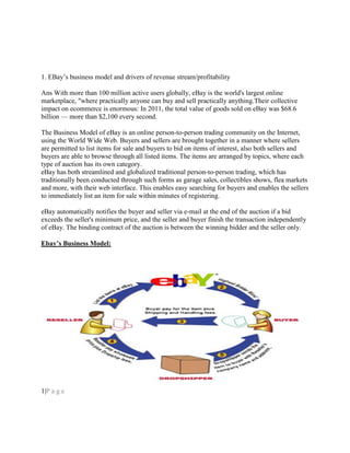 eBay's future strategy should focus on either maintaining its existing business model or expanding its core marketplace platform. Maintaining its model would involve improving its auctions and fixed price offerings through lowering seller fees to attract more activity. Expanding could entail shifting focus to mobile devices and local inventory to attract more buyers. Additionally, eBay is looking to partner with physical retailers to drive online and store sales. It is also launching a new developer platform called X.commerce that combines technologies like PayPal, Milo, Red Laser, and Magento to help retailers expand their online and mobile presence.