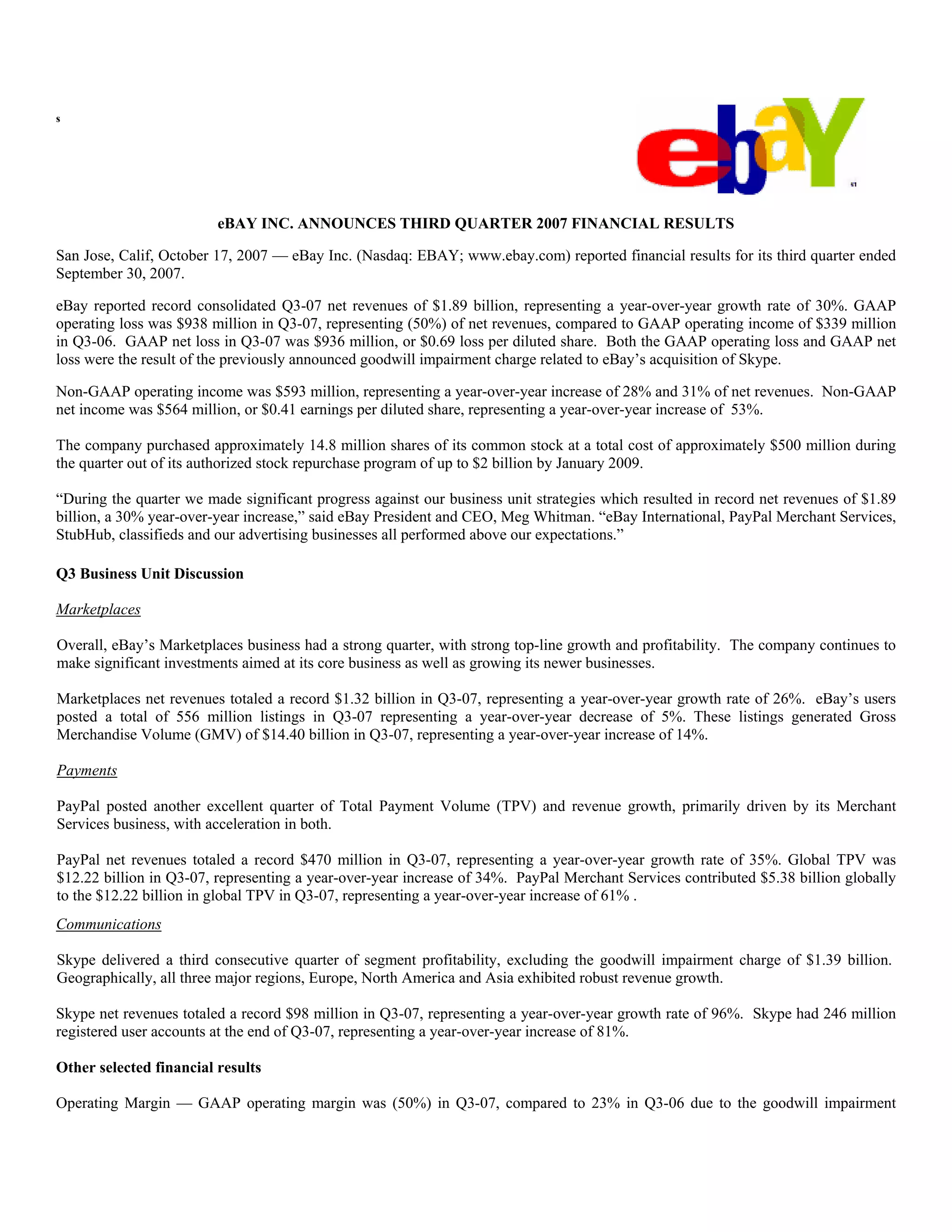 - eBay reported record Q3 2007 revenues of $1.89 billion, up 30% year-over-year, but had a GAAP operating loss of $938 million and net loss of $936 million due to a goodwill impairment charge related to Skype. Non-GAAP operating income was $593 million, up 28% year-over-year. - Marketplaces revenues were $1.32 billion, up 26% year-over-year, while listings fell 5% and GMV rose 14%. PayPal revenues rose 35% to $470 million and TPV grew 34%. Skype revenues rose 96% to $98 million. - For Q4, eBay expects revenues of $2