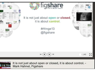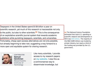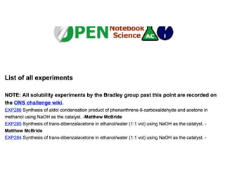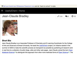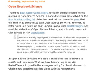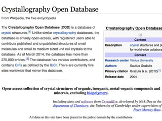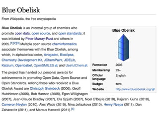 This document discusses open data and open science. It highlights Jean-Claude Bradley as a pioneer of open notebook science and open data who believed closed data means people die. It describes tools like ContentMine that can automatically extract data like chemical reactions, phylogenetic trees and clinical trial results from papers. Visitors can extract specific types of data while repositories can solve problems communally with continuous publication and validation.