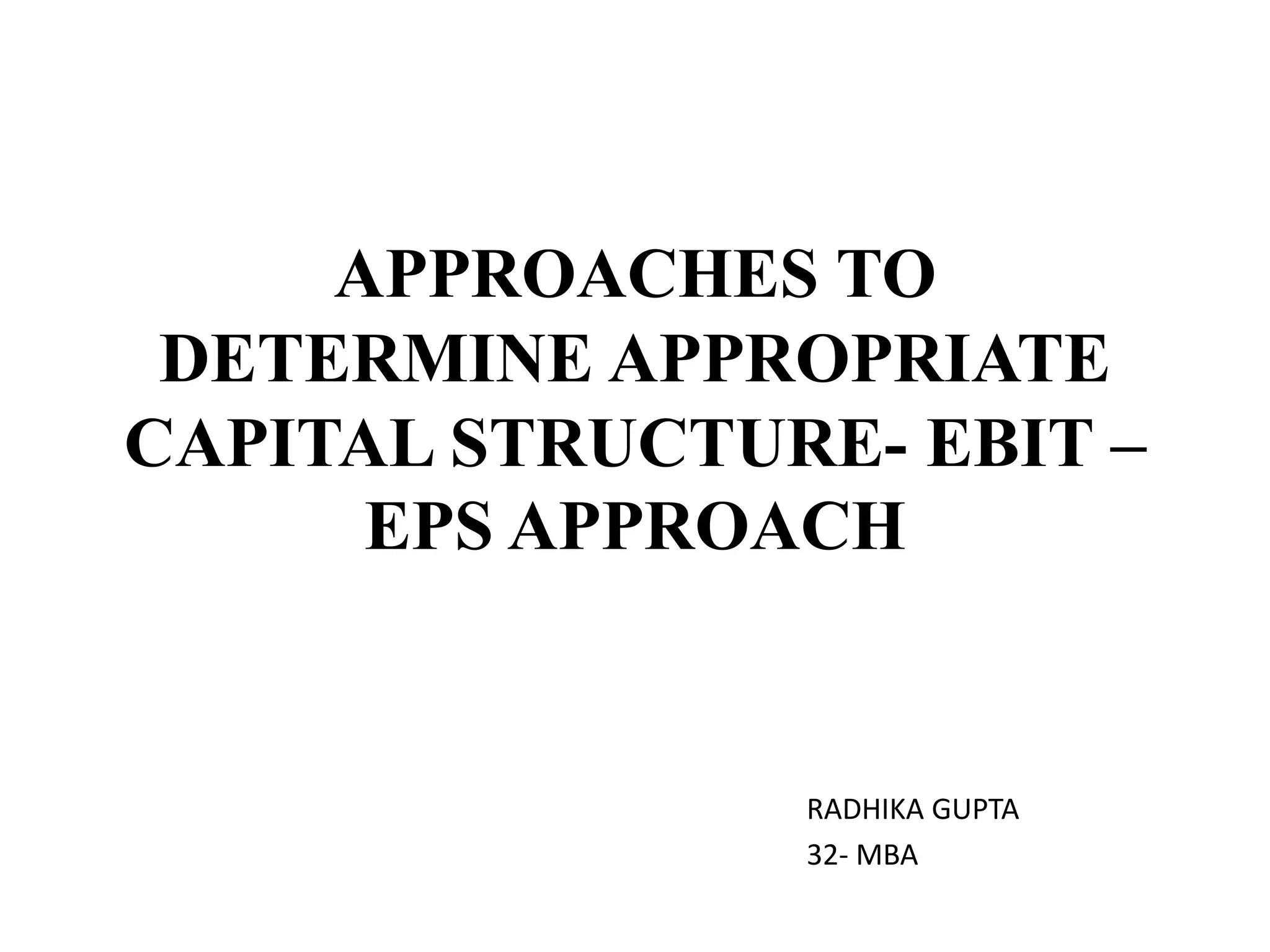The document discusses the EBIT-EPS approach for determining appropriate capital structure. The EBIT-EPS approach involves selecting a capital structure that maximizes earnings per share (EPS) over the expected range of earnings before interest and taxes (EBIT). Managers use this approach to balance debt and equity financing by analyzing how different capital structures affect EPS at given EBIT levels. However, the approach does not consider risk premiums associated with higher debt levels and may not always be the best tool for capital structure decisions.