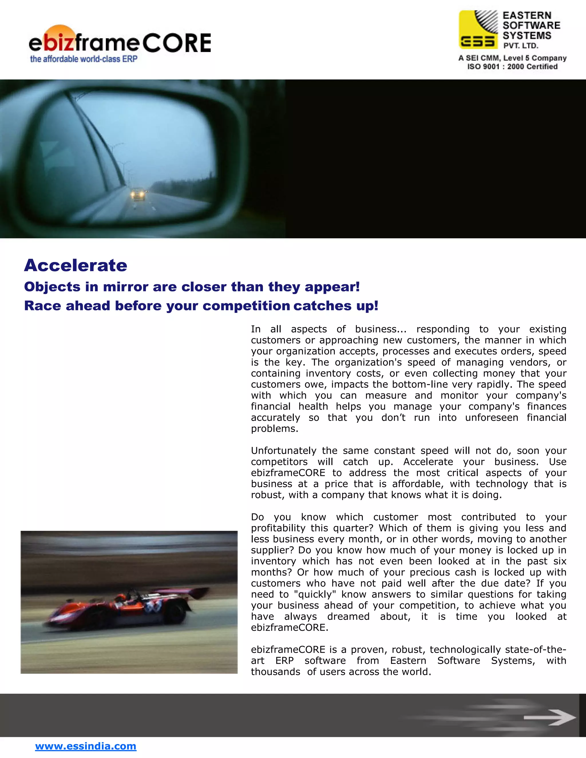 The document promotes ebizframecore, an ERP software by Eastern Software Systems, emphasizing its role in accelerating business processes, improving operational efficiency, and enabling data-driven decision-making. It highlights features such as real-time monitoring of financial health, integration of various business functions, and automation of reporting and procurement cycles. The software is presented as a cost-effective, robust solution that facilitates better management of customer relationships, inventory, and overall business responsiveness.