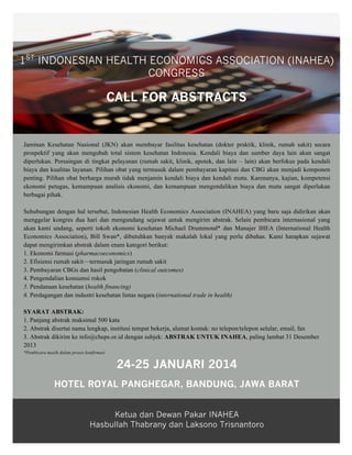 Kongres pertama Indonesian Health Economics Association (INAHEA) akan diselenggarakan pada 24-25 Januari 2014 di Hotel Royal Panghegar, Bandung. Kongres ini akan membahas berbagai topik ekonomi kesehatan terkait implementasi Jaminan Kesehatan Nasional (JKN) seperti ekonomi farmasi, efisiensi rumah sakit, pembayaran berbasis diagnosis, dan pendanaan kesehatan. Para peneliti diajak mengirimkan abstrak maksimal 500 kata ke email tertentu p