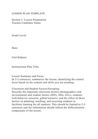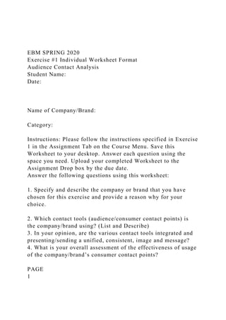 The document outlines a comprehensive individual worksheet format for an exercise in an educational course, focusing on audience contact analysis for a chosen company or brand. It includes instructions on lesson planning, preparation, and assessment, addressing various student needs and instructional strategies to support diverse learners. Additionally, it establishes criteria for evaluating the effectiveness of lesson components, including alignment with standards, instructional strategies, and assessment methods.