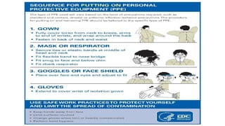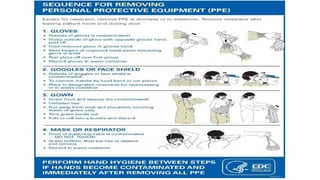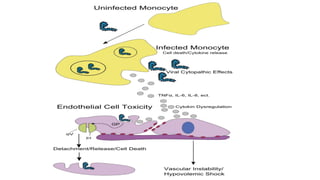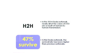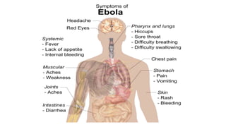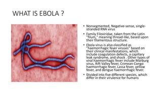 This document provides information on Ebola virus disease. It begins by describing Ebola virus as a nonsegmented, negative-sense RNA virus of the Filoviridae family. It is divided into five species which differ in virulence for humans. The document then discusses the epidemiology and transmission of Ebola, noting it is transmitted through contact with bodily fluids of infected humans or animals. It provides details on past outbreaks and the current 2014 outbreak. Clinical features including initial flu-like symptoms, rash, gastrointestinal issues, and hemorrhaging are summarized.