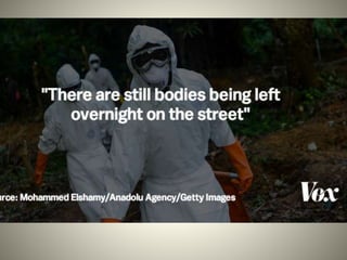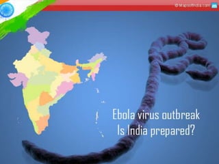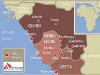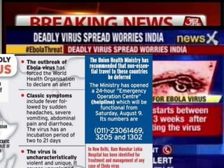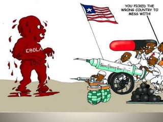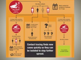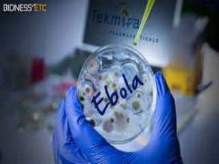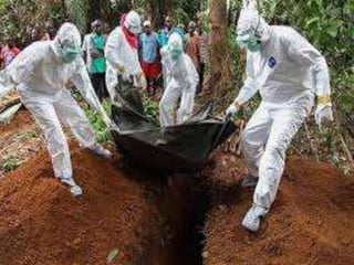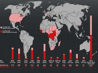 The Ebola virus has caused several outbreaks in Africa since 1976. It is transmitted through direct contact with bodily fluids and can cause hemorrhagic fever with severe symptoms and high fatality rates. While there is no approved vaccine or treatment, outbreaks are managed through isolation protocols, contact tracing, and supportive care to control symptoms. Diagnosis involves blood tests to detect antibodies or the virus's genetic material. The threat of Ebola epidemics remains due to the virus's history of recurring outbreaks in Central Africa.