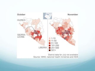 Ebola virus disease is a severe and often fatal illness in humans that was first identified in 1976. The virus spreads through direct contact with body fluids from infected humans or animals. Early symptoms include fever, fatigue, and muscle pain that can progress to vomiting, diarrhea and internal bleeding. While there is no licensed treatment, supportive care such as rehydration can improve survival. The 2014-2015 outbreak in West Africa was the largest in history, resulting in over 23,000 cases and 9,600 deaths across multiple countries. Controlling the outbreak requires community engagement along with safe practices in healthcare settings and burials.