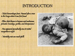 Ebola hemorrhagic fever, named after a river in the Congo, is a highly fatal disease with a mortality rate up to 90%, affecting humans and nonhuman primates. It is caused by the Ebola virus, which has five distinct sub-species and is of zoonotic origin, primarily found in Africa. Symptoms include a wide range of physical issues, progressing to severe manifestations like bleeding and shock, with death usually resulting from shock rather than blood loss.
