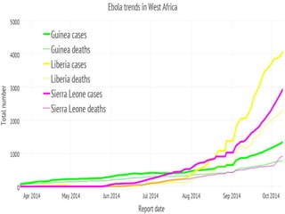 This document summarizes information about the Ebola virus outbreak in West Africa from 2014-2015. It provides background on Ebola virus, details past outbreaks between 1976-2012, and describes the current 2014 outbreak as the largest involving cases in Guinea, Liberia, and Sierra Leone. It discusses the spread, case numbers and deaths over time, risk factors, and important dates in the outbreak.