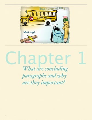 This document provides guidance on writing effective concluding paragraphs. It defines concluding paragraphs and explains their purpose is to summarize key points, restate the thesis, and demonstrate broader significance. The document outlines the three parts of a concluding paragraph: restating the thesis, summarizing arguments, and including a concluding statement. It also discusses characteristics of strong concluding paragraphs and emphasizes the importance of coherence across the entire essay.