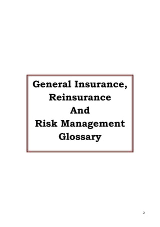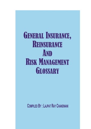 This document provides a glossary of over 7,500 insurance, reinsurance, and risk management terms. It was compiled by the author over 18 months through extensive research of source materials. The glossary is in alphabetical order and includes cross-references. While not encyclopedic, it aims to be accurate and understandable for non-specialists. The author acknowledges the contributions of learned authors, institutions, and source materials in compiling this resource. Feedback is welcomed to improve future editions.