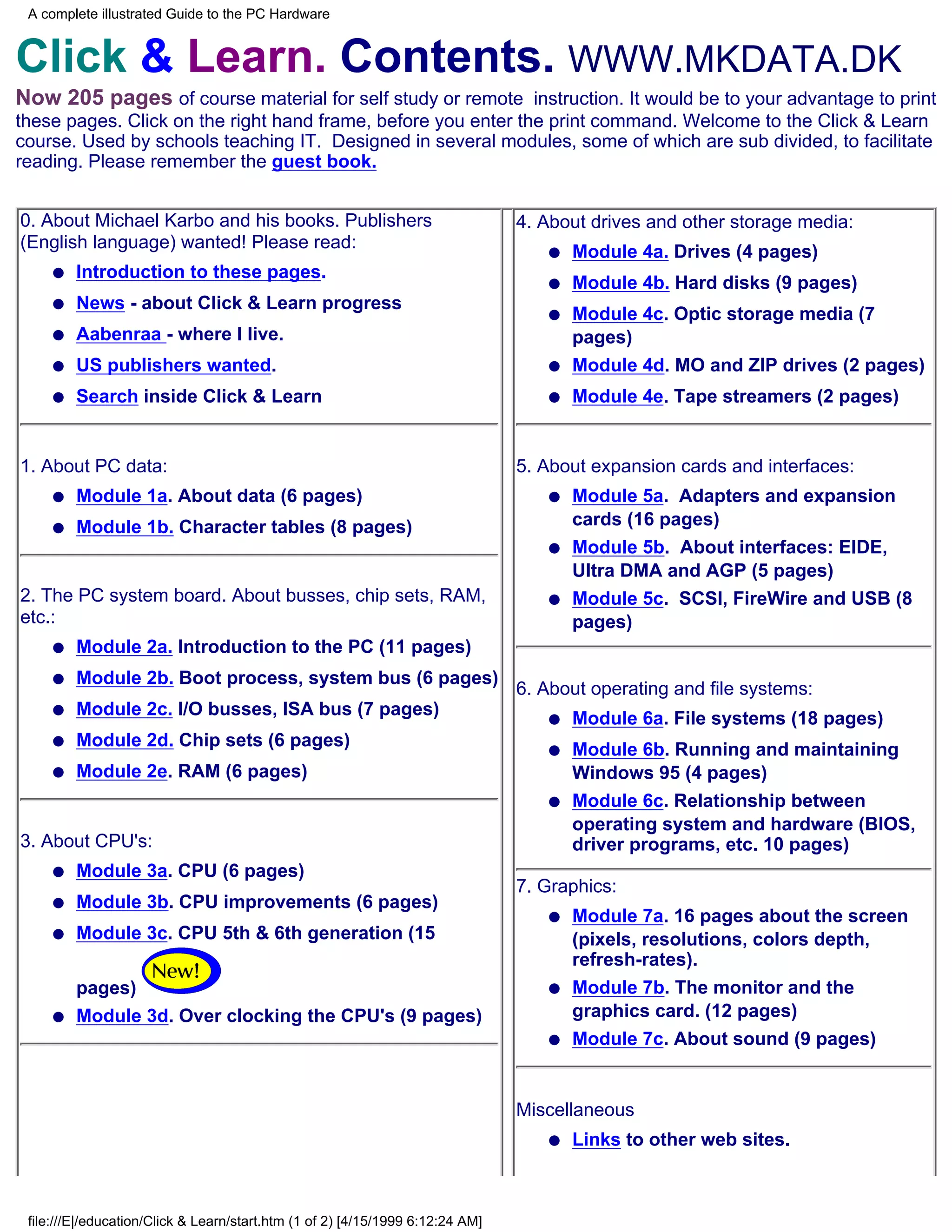 The document provides an overview of a complete illustrated guide to PC hardware in 205 pages. It is divided into several modules covering topics such as data, the PC system board, CPUs, drives, expansion cards, operating systems, graphics, and more. The guide is designed for self-study or remote instruction and explains how PCs process digital data using binary numbers, bits, and bytes to represent analog information electronically.