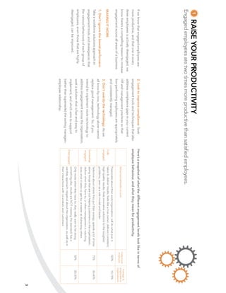The document discusses the critical importance of employee engagement, highlighting that only one in three employees is fully engaged and the significant financial loss organizations face due to disengagement. It emphasizes the need for constant feedback, recognition, and alignment of employee goals with corporate objectives to enhance productivity and reduce turnover. The document also outlines strategies and benefits of utilizing social performance management technologies to improve engagement and ultimately drive better business outcomes.