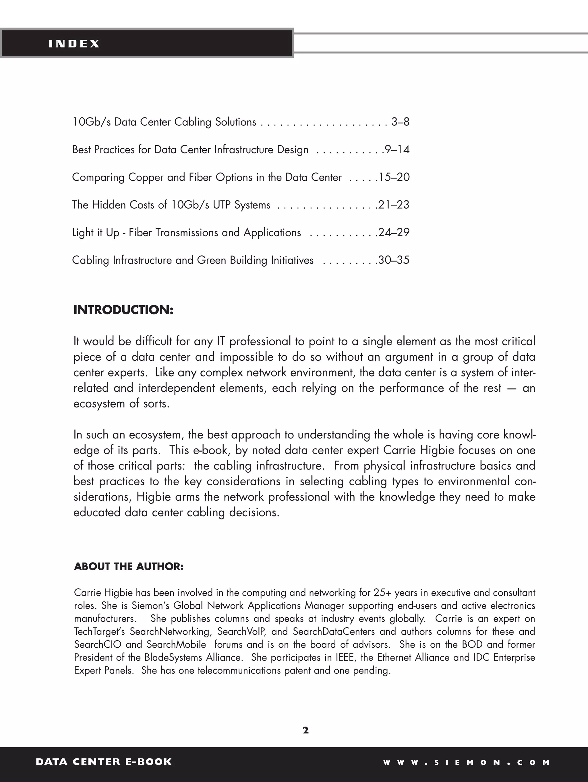 The e-book focuses on data center cabling infrastructure, emphasizing the importance of cabling systems as core elements of data center design. It provides best practices for planning and implementing reliable, scalable, and efficient cabling solutions, along with considerations for environmental controls and system redundancies. Authored by Carrie Higbie, an expert with over 25 years in networking, the document offers insights into trends, cost implications, and the evolving nature of data centers in the face of technological advancements.
