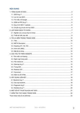 Tài liệu 'inet seo master 2014' cung cấp hướng dẫn chi tiết về SEO website từ cơ bản đến nâng cao, nhằm giúp độc giả phát triển kỹ năng trở thành SEO master. Tác giả Nguyễn Trọng Thơ, với hơn 12 năm kinh nghiệm, chia sẻ kiến thức về quy trình SEO, từ việc nghiên cứu từ khóa đến tối ưu hóa nội dung và xây dựng liên kết. Nội dung còn bao gồm các yếu tố kỹ thuật cần thiết và cách thực hiện các phương pháp SEO hiệu quả.