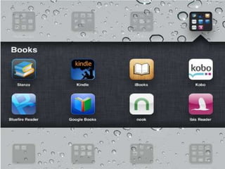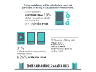 The document discusses the evolution of e-books and the impact of various digital formats and DRM on the e-publishing industry. It highlights the rise of e-readers and tablets, innovative publishers, and the complexities of e-book formats such as EPUB and AZW. Additionally, it addresses issues related to digital rights management and encourages libraries to support all types of readers and e-reading devices.
