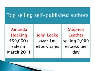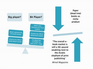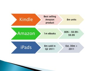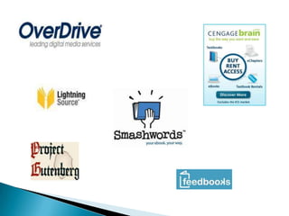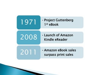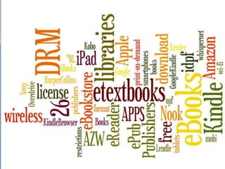 The document discusses the transformative impact of ebooks on the publishing industry, highlighting trends such as the rising popularity of e-readers and the changing dynamics in libraries and consumer behavior. It notes significant growth in ebook sales, the varying adoption rates among different demographics, and the anticipated shift towards ebooks becoming the default format for educational materials. The future of the market is forecasted to include innovations like enhanced ebooks and new business models for publishing.