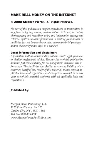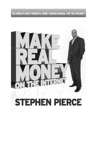 This document provides an introduction to a program about making real money on the internet. It discusses the author's background, including a lack of formal education and past financial struggles. It then describes how the author unintentionally started providing stock and forex trade picks online for free, which attracted a large following. This led to someone offering to pay $5,000 to learn the author's trading methods, providing a paradigm shift and new perspective on the value of his skills and information.
