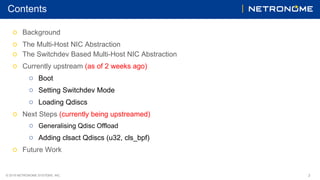 The document presents a proposal for a fully flexible datapath for a multihost NIC, leveraging technologies like switchdev, qdisc offload, cls_bpf, and XDP. Key steps in implementation are outlined including initialization and qdisc setup, with ongoing work focused on extending functionality and upstreaming enhancements. The presentation highlights collaborative efforts and invites further discussion on the advancements made in networking architecture.