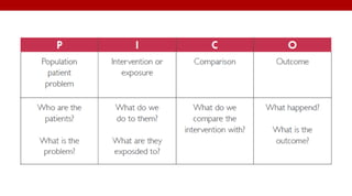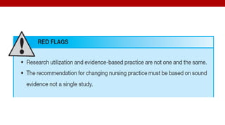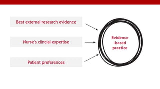 This document discusses evidence-based practice (EBP) in nursing and healthcare. It defines EBP as using research-based evidence to guide holistic patient care. The benefits of EBP include improved patient outcomes, reduced costs, and enhanced nursing practice. EBP involves five steps: asking a clear clinical question, acquiring evidence, appraising the evidence, applying the evidence to practice, and assessing outcomes. Barriers to EBP include lack of time, resources, and skills to implement research into practice. Overall, the document emphasizes that properly applying EBP through all five steps can help strengthen nursing practice and improve patient care.