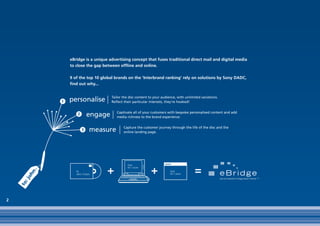 eBridge is a direct marketing tool that personalizes discs mailed to customers which, when inserted into their computer, greet them personally and direct them to a branded website where they can request information, provide their contact details, and book test drives of vehicles. Several automotive brands, including Audi, BMW, Lexus, Maserati, Mercedes-Benz, and Porsche, have used personalized eBridge discs in direct mailings to generate high lead volumes and conversion rates for requests, registrations, and test drives.