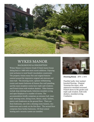Wykes Manor is a historic Grade II listed manor house dating to the late 17th century located in rural South Lincolnshire. The property has impressive original features like oak staircases and panelled walls. It sits on around 1.25 acres with gardens, outbuildings like a Grade II listed trap house, and the potential to rent additional acreage. Wykes Manor is surrounded by pastoral countryside and offers tremendous seclusion and privacy.