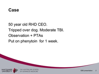 This document presents an evidence based surgery presentation on the use of prophylactic anticonvulsants for traumatic brain injury. It includes a case study of a 50 year old man who suffered a moderate traumatic brain injury and was given phenytoin for one week. The presentation reviews the PICO question of whether prophylactic anticonvulsants are effective for any patients with traumatic brain injury. It then outlines the literature search methodology and key findings, including that prophylactic phenytoin reduces early seizures after injury but not thereafter, and there is a role in suppressing early seizures for moderate to severe head injuries. Indications for use are also presented.