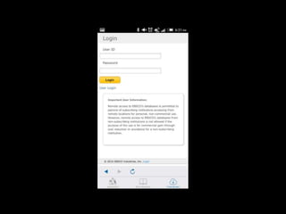 This document provides instructions for accessing and using the EBSCO database through the u-Pustaka portal. It explains how to log in to the portal, navigate to the EBSCO link, and introduces the main features and search functions available on the EBSCO platform, including searching for articles, companies, and ebooks. Screenshots illustrate steps like selecting databases, performing searches using Boolean operators, viewing search results, and downloading materials. Mobile access and use of the MyEBSCOhost folder are also outlined.