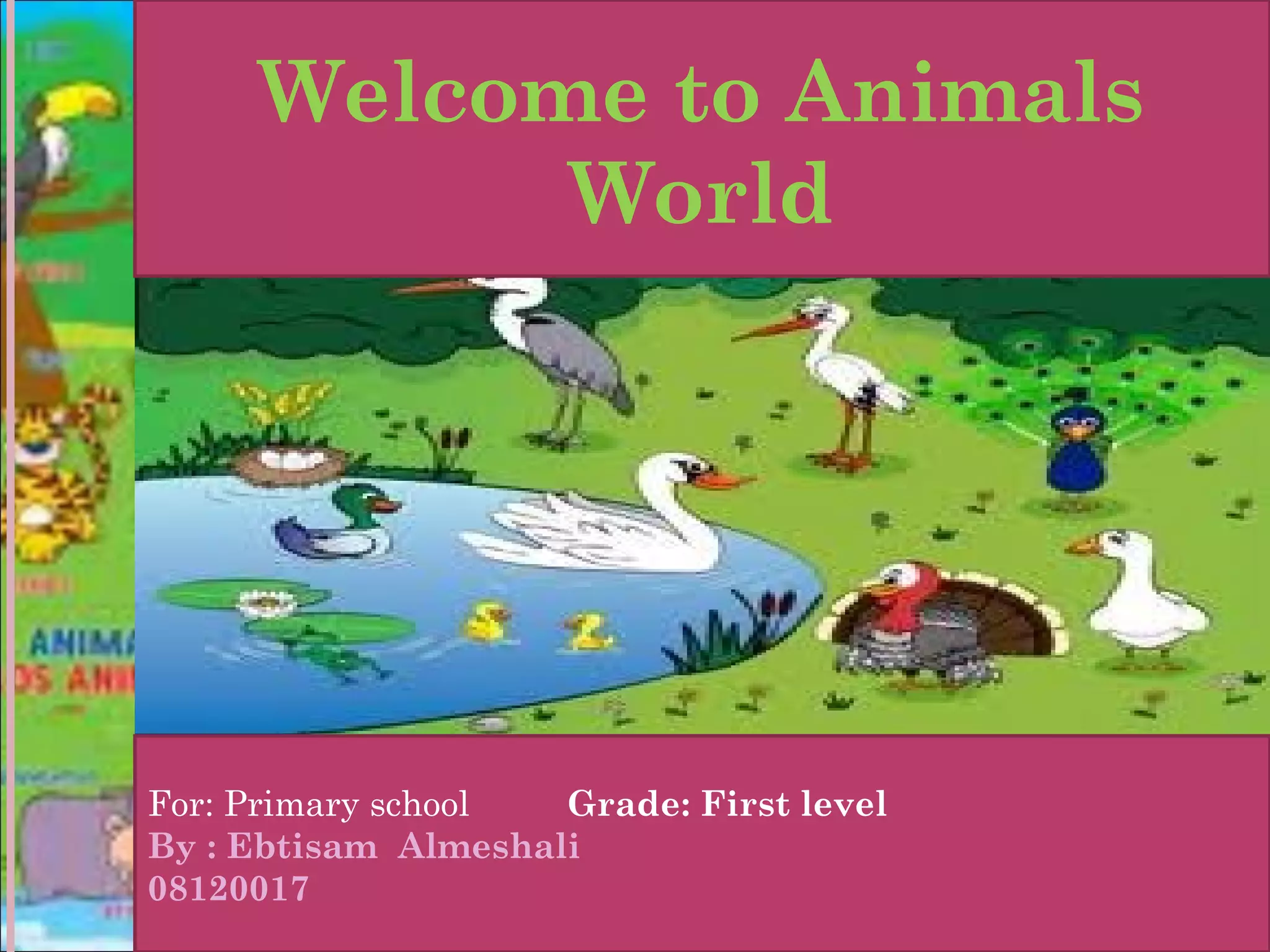 The document introduces a lesson plan for teaching first grade primary students about different animals. It includes introducing animals' names, sounds, and favorite foods. The teacher will present this information and include interactive activities for the students to solve. The purpose is for students to learn vocabulary about different animals and to assess their understanding of the lesson.