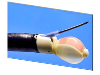 EBUS is a bronchoscopic technique that uses ultrasound to visualize structures within the airway wall, lung, and mediastinum. It uses radial or convex probes. Radial probes provide 360-degree images of the airway wall and surrounding structures at high definition but do not allow for real-time biopsy. Convex probes have a 90-degree angle of view and allow for real-time EBUS-guided biopsy. EBUS is used to diagnose and stage lung cancers and mediastinal masses and can guide procedures like airway stenting. It has advantages of being minimally invasive and having a high diagnostic yield.