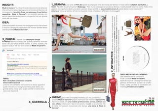 Il documento descrive una campagna di marketing per il brand made in carcere®, che utilizza strategie innovative come stampe pubblicitarie ironiche, adesivi interattivi e campagne Google AdWords per promuovere borse realizzate da detenute. L'obiettivo è mettere in evidenza la storia dietro ogni prodotto, sottolineando la differenza rispetto ai famosi brand di moda. Infine, è prevista una sfilata con una modella professionista che indosserà un accessorio made in carcere® per aumentare la visibilità della campagna.