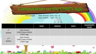 Ang dokumento ay isang Philippine Early Childhood Checklist na nagtatala ng mga kakayahan, ugali, at kaalaman ng mga batang may edad 3 hanggang 5.11 taon. Naglalaman ito ng iba't ibang domain tulad ng gross motor, fine motor, self-help, receptive language, expressive language, cognitive, at social-emotional, na sinusukat tatlong beses sa isang taon upang matulungan ang mga magulang sa pag-aalaga at pagtuturo sa kanilang mga anak. Ang mga resulta ay nagbibigay ng mga iskor at talaan ng mga obserbasyon ng mga magulang at tagapangalaga.