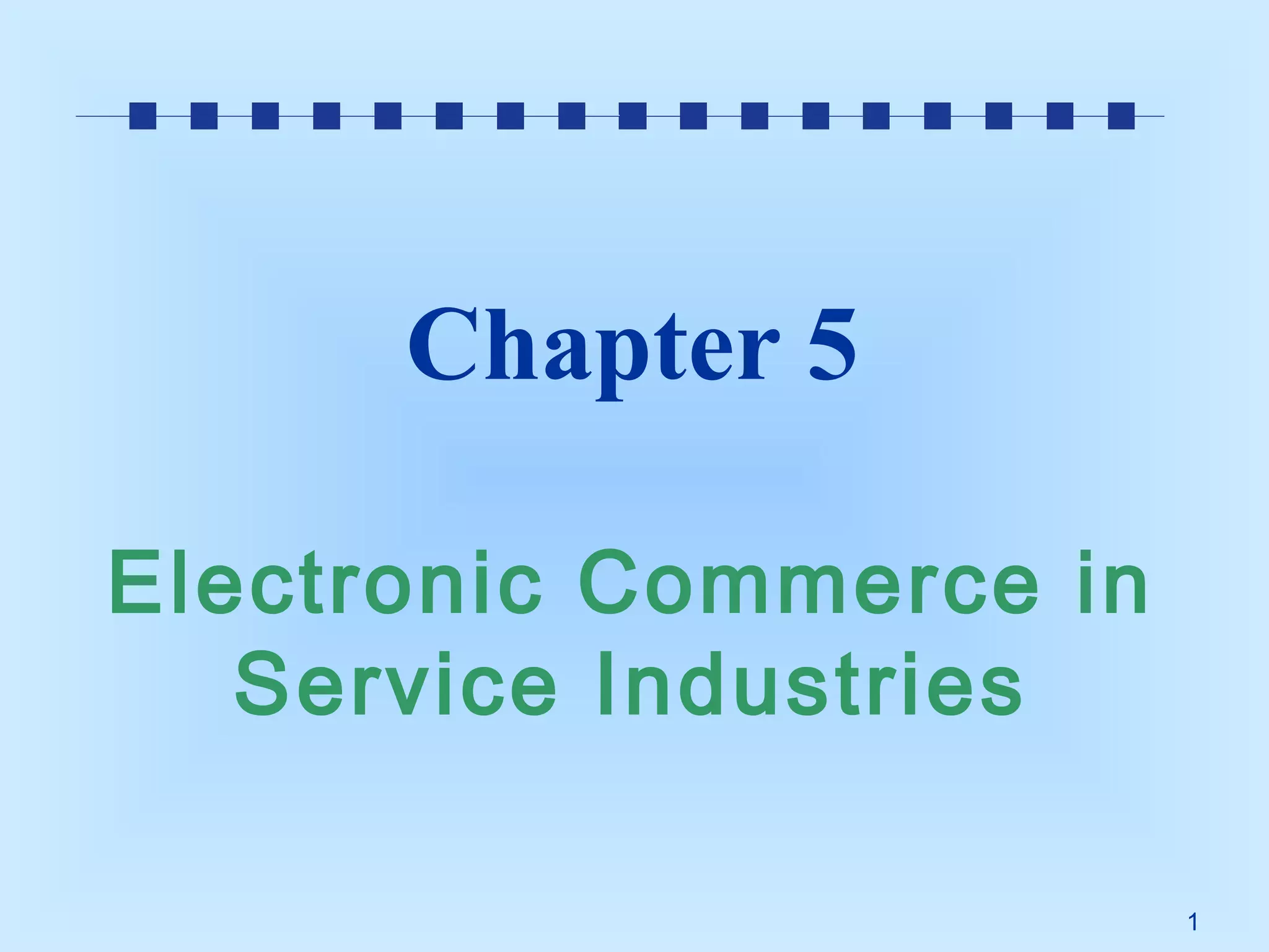 This document discusses various service industries that have been impacted by electronic commerce, including travel/tourism, employment placement, real estate, investing/trading stocks online, cyberbanking/personal finance, billing online, online publishing, knowledge dissemination, and disintermediation/reintermediation. It provides details on how each industry has been transformed through opportunities like online research/booking, electronic job posting/applications, virtual property tours, online trading platforms, digital banking services, electronic bill payment, and distance learning/online education. The roles of intermediaries are changing as well, with some being disintermediated and others taking on new functions as cybermediaries.
