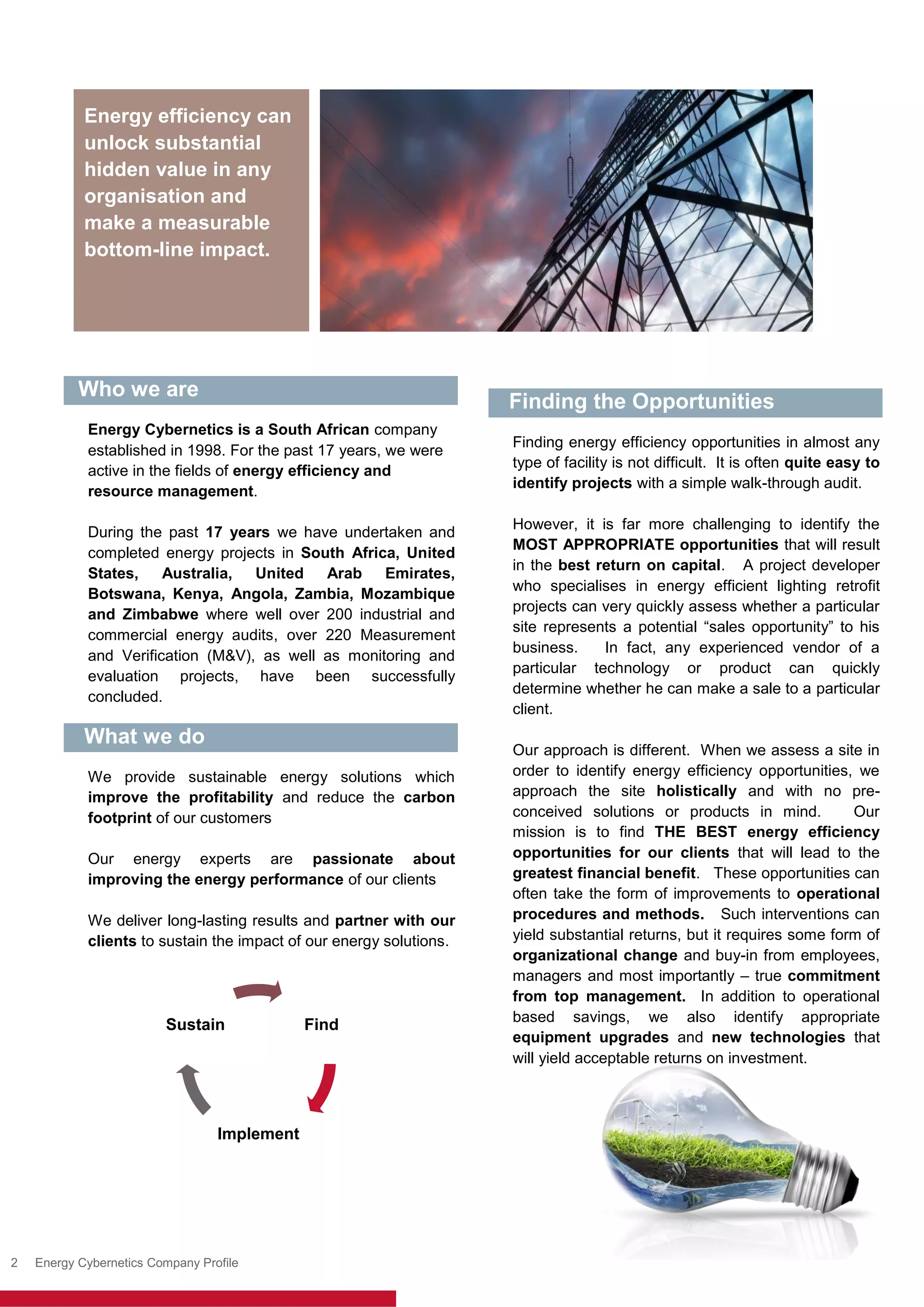 Energy Cybernetics is a South African company established in 1998 that specializes in energy efficiency and resource management solutions. They have completed over 200 energy audits and 220 measurement and verification projects across multiple African and global countries. Energy Cybernetics takes a holistic approach to identifying the best energy efficiency opportunities for clients through improvements to operations as well as equipment upgrades. They implement projects using their in-house project management team and draw on partnerships for delivery. Energy Cybernetics also provides energy management training and works with clients long-term to sustain results through monitoring and reporting. They have a track record of 17 years providing these services in Southern Africa.