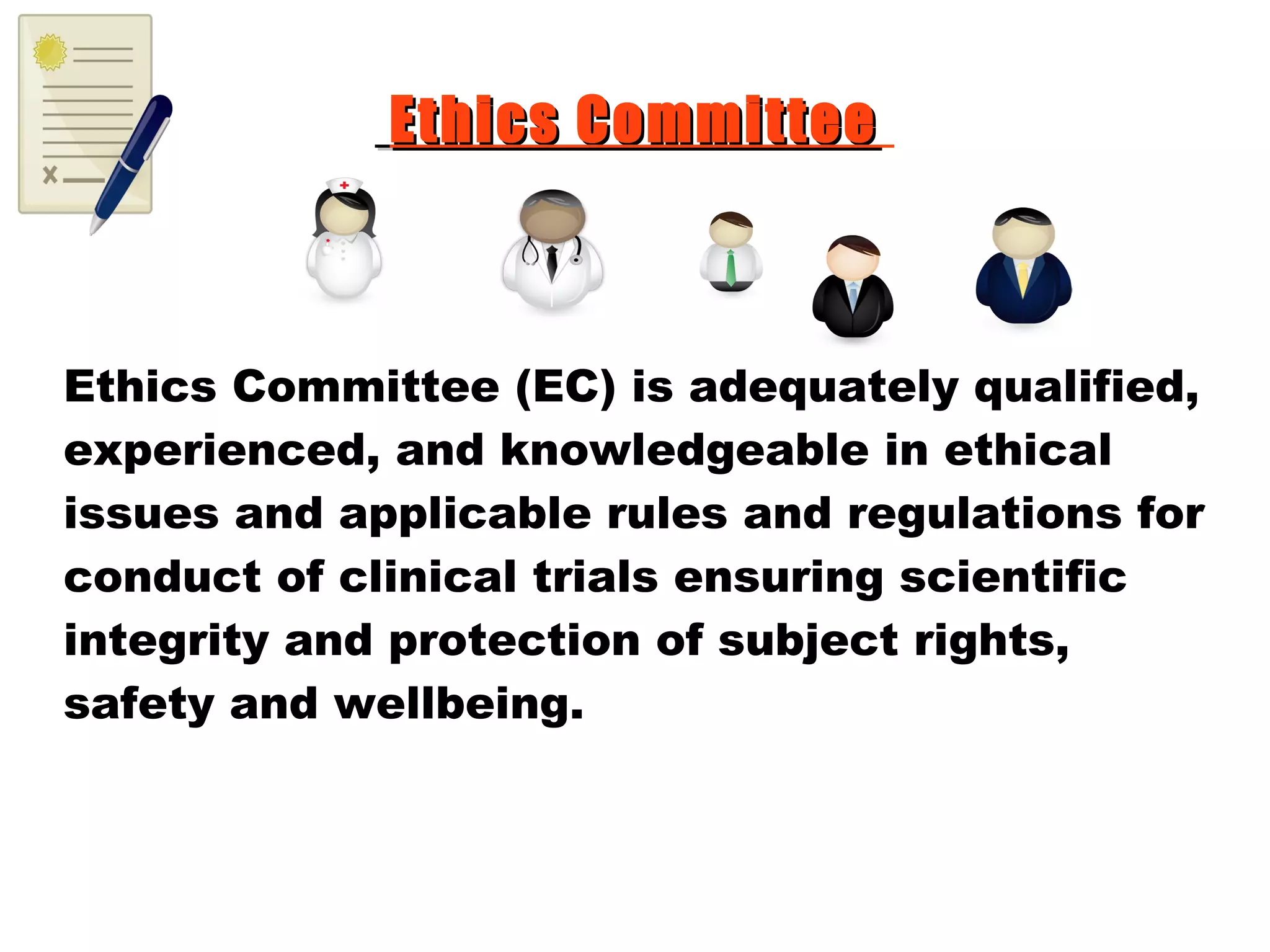 The document outlines the procedures and responsibilities of an Ethics Committee for overseeing clinical trials. It discusses procedures for the composition of the committee, handling conflicts of interest, reviewing study protocols and informed consent documents, making decisions on studies, monitoring approved studies, and archiving documentation. The Ethics Committee is qualified to ensure scientific integrity and subject protection in clinical trials under its purview.