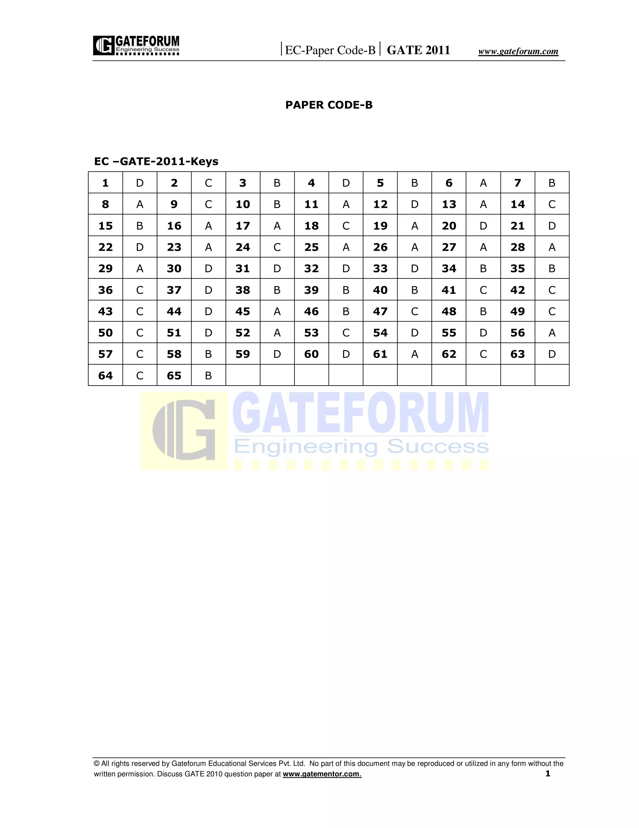 This document is a key to the answers for a GATE 2011 paper code B exam. It lists the answers to the 65 multiple choice questions as letters A-D without providing the questions.