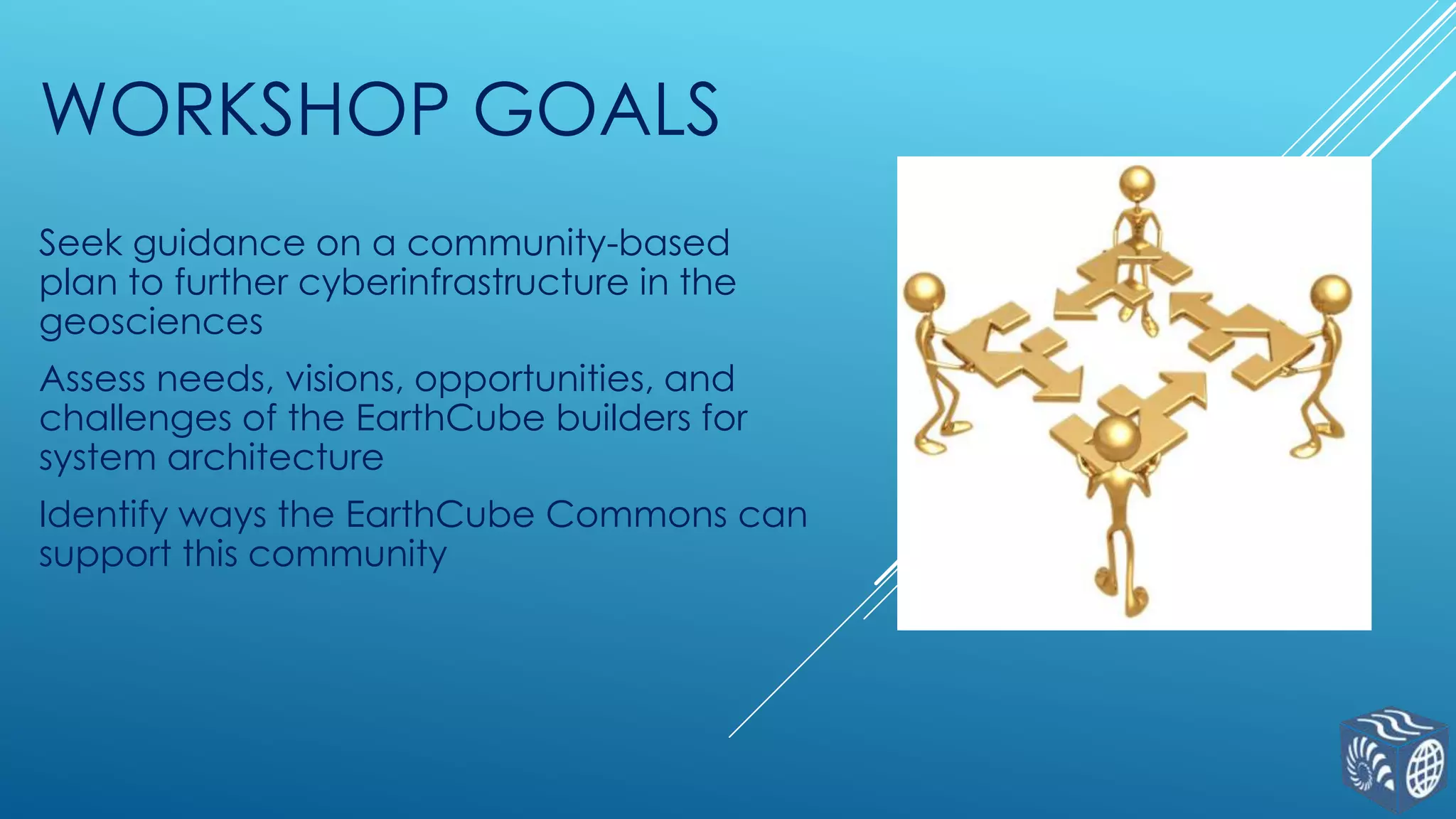 The EarthCube Community Workshop held from February 12-14, 2014, focused on developing a community-driven plan to enhance cyberinfrastructure in the geosciences, identifying needs and opportunities for EarthCube builders. It emphasized the importance of governance within the EarthCube initiative, highlighting stakeholder engagement and the need for collaboration across various communities. The workshop also outlined a timeline for organizational development and future workshops aimed at fostering community involvement.